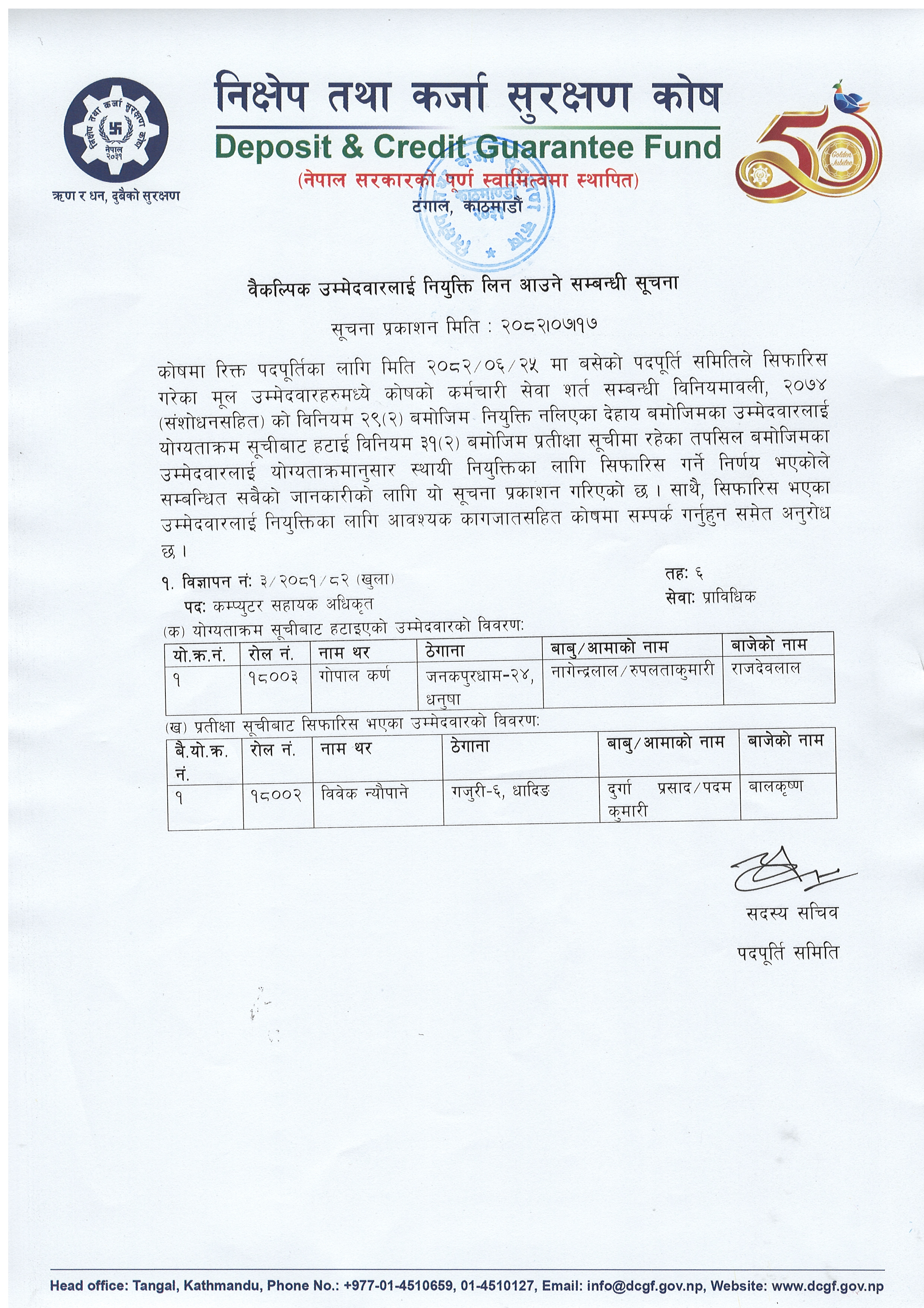 वैकल्पिक उम्मेदवारलाई नियुक्ति लिन आउने सम्बन्धी सूचना